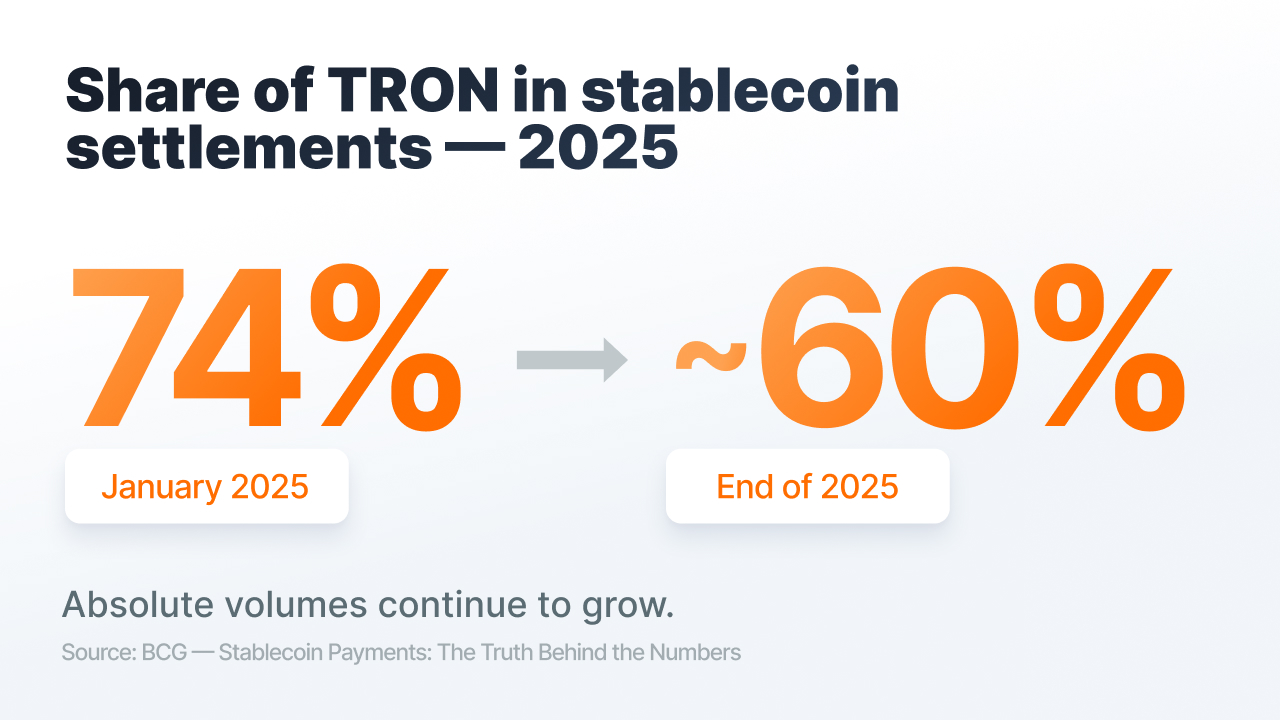 In 2025, TRON's share of real economic stablecoin flows dropped by around 14% by the end of the year — total volumes continued to grow. The new volume is being generated by a different type of participant with different operational requirements.